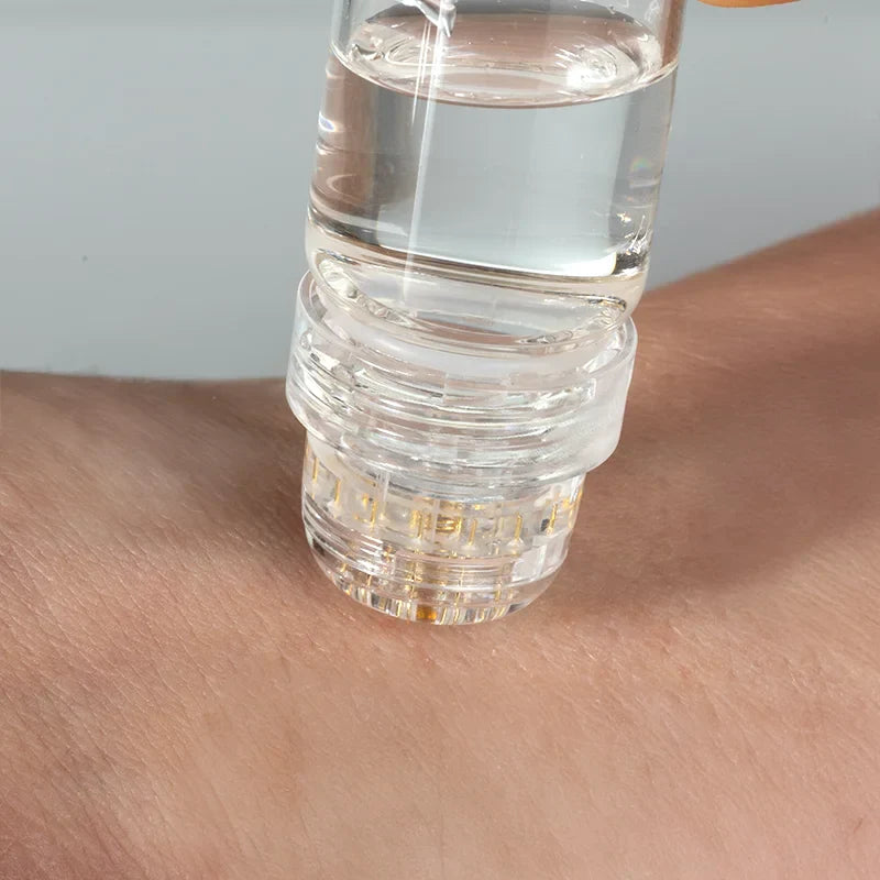 2. Préparez l'élixir : Vissez la fiole sur la tête 24K, retournez 2 minutes. Le sérum doré imbibe les micro-aiguilles comme une éponge précieuse