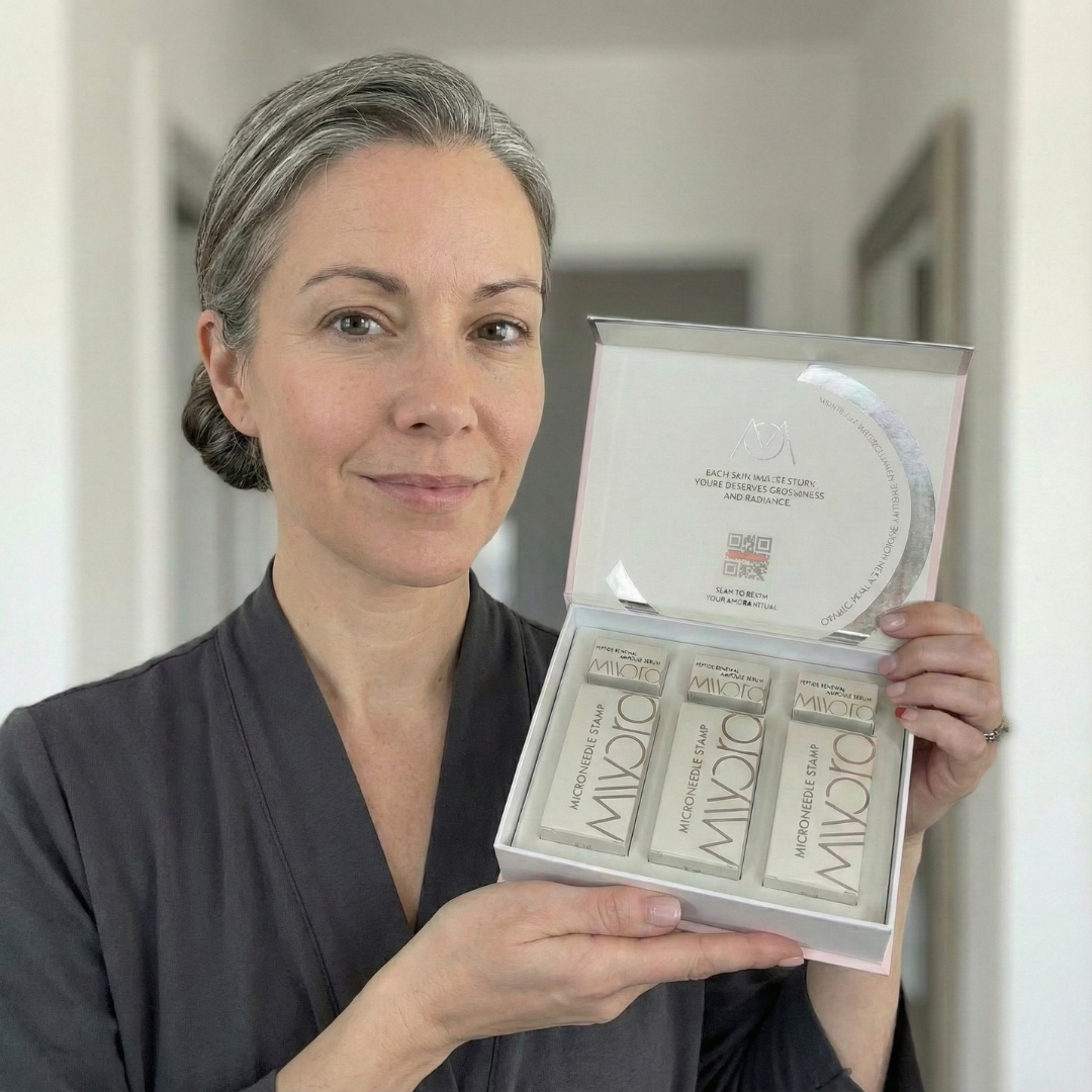 Les micro-aiguilles en or 24 carats créent des milliers de micro-canaux qui permettent à notre sérum enrichi au Replexium et acide hyaluronique de pénétrer là où commence la vraie transformation — au cœur de votre derme.