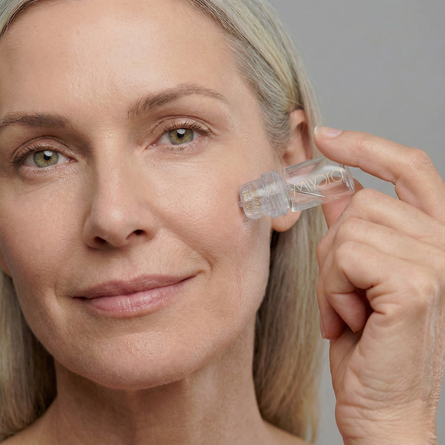 Nos micro-aiguilles en or 24K créent des micro-canaux pour diffuser le Replexium et les peptides régénérants au cœur de votre épiderme, là où le collagène se forme et où votre peau se renouvelle vraiment.